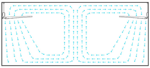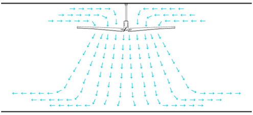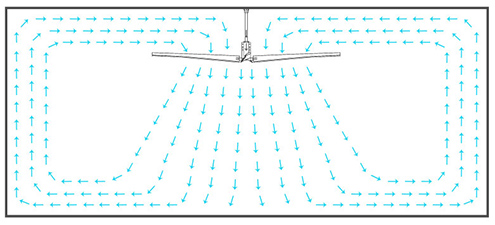 DW系列工業大風扇流線型變截面扇葉緩慢地旋轉,推動大量氣流由上而下成錐形吹向地面,向兩側流動,由此產生水平方向的氣流層,持續不斷、立體循環。