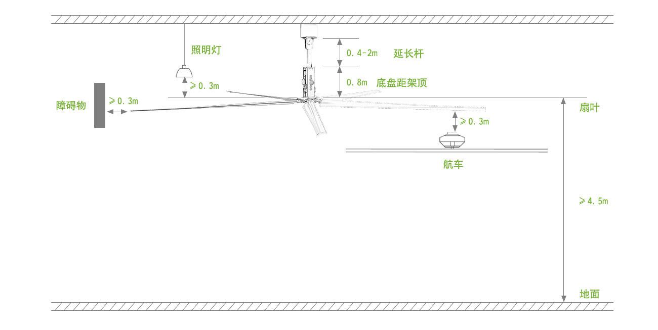 建筑總高度要求大于4.5米,24FT型號廠房凈高應不高于12米,20FT型號廠房凈高應不高于16米,16FT型號廠房凈高應不高于18米,12FT-08FT型號廠房凈高應不高于8米,支撐柱間距應大于擬安裝風扇直徑0.4米以上,屋頂結構應允許承重150公斤以上。