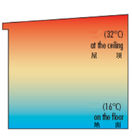 因為熱空氣的密度比冷空氣要低,所以設(shè)備供應(yīng)出來的暖氣都向屋頂上升,在屋頂溫度達到28-30℃時,而地面溫度卻在14℃左右,所以員工感覺寒冷,工作相當(dāng)不適,從而降低工作效率。