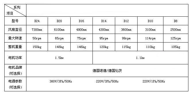下圖為具體的超大吊扇直徑列表及配置參數: