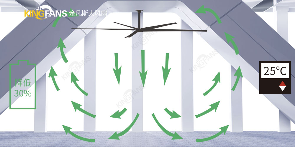 超大直徑的風扇運轉,形成大量氣流向下推動,遇到地面后產生水平方向的氣流,向四周擴散開。氣流擴散的速度與扇葉轉速有關。如果風扇連續運轉,氣流就會向外大量推移,直至遇到障礙物或墻壁隨之反向推動上升,形成多角度、無死角巨量氣流,全面覆蓋各個角落循環通風,實現全方位空氣循環。